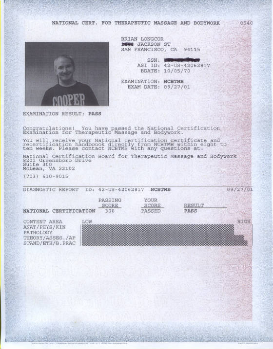 Passed Nationally Certified in Therapeutic Massage and Bodywork exam (2001) (now resigned from